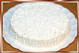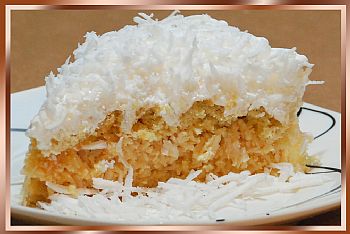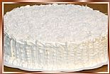 BOLO BRANCO COM CREME A BASE DE LEITE CONDENSADO E CALDA ESPECIAL, COBERTO COM CHANTILY E COCO FRESCO