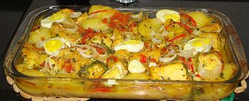 Com batatas, pimentão, ovo cozido, azeitona, cebola, tomate, alho e azeite.