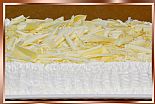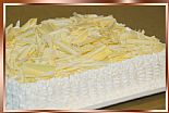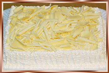 PÃO-DE-LÓ RECHEADO DE BRIGADEIRO BRANCO, COBERTO DE BRIGADEIRO BRANCO CREMOSO E CHOCOLATE BRANCO RASPADO