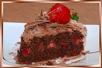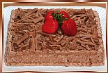 BOLO DE CHOCOLATE BRIGADEIRO COM PEDAÇOS DE MORANGO, COBERTURA DE BRIGADEIRO CREMOSO E RASPAS DE CHOCOLATE